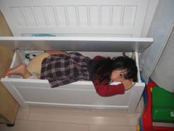 今日はもういいかーいっておもちゃ箱に隠れてました。